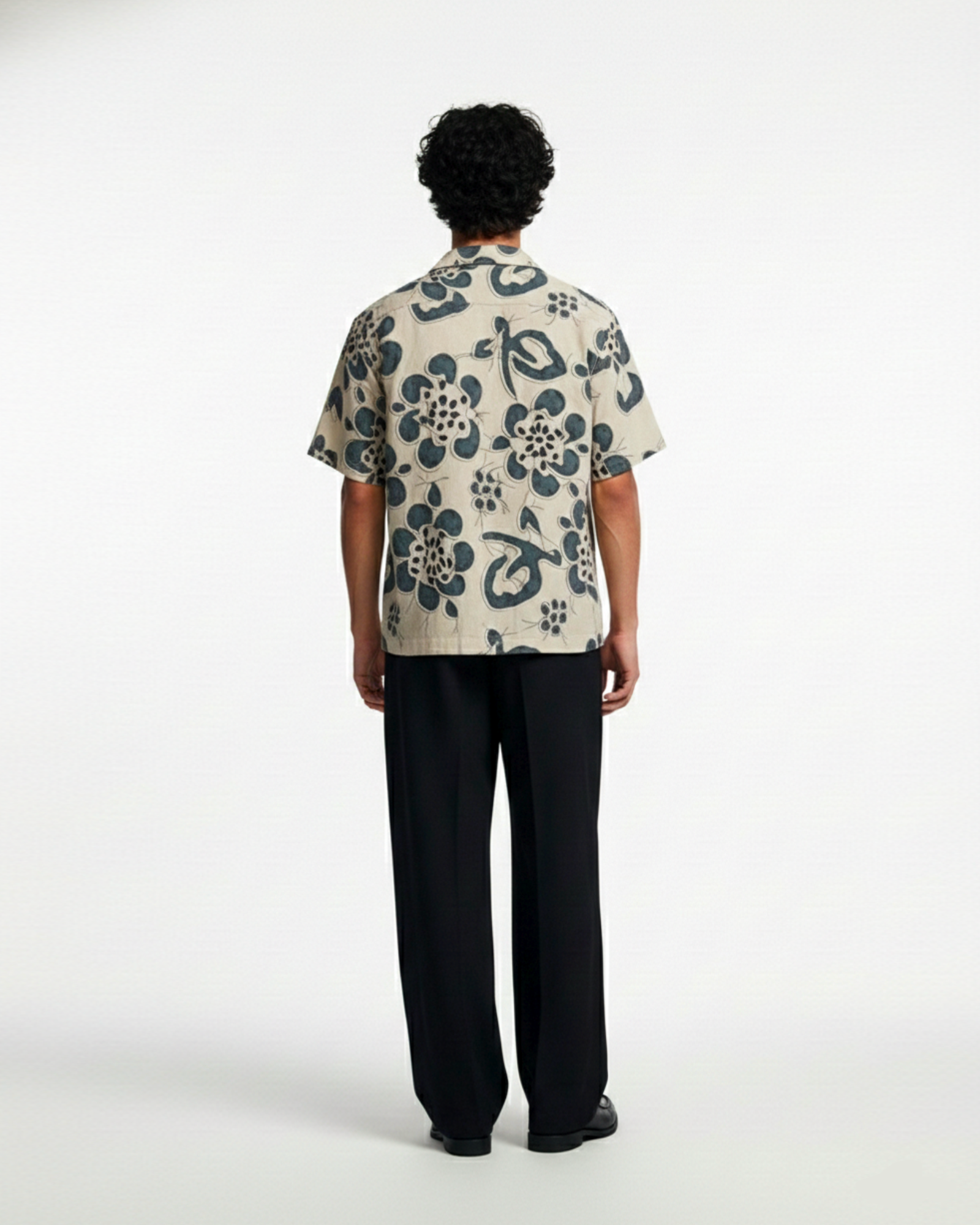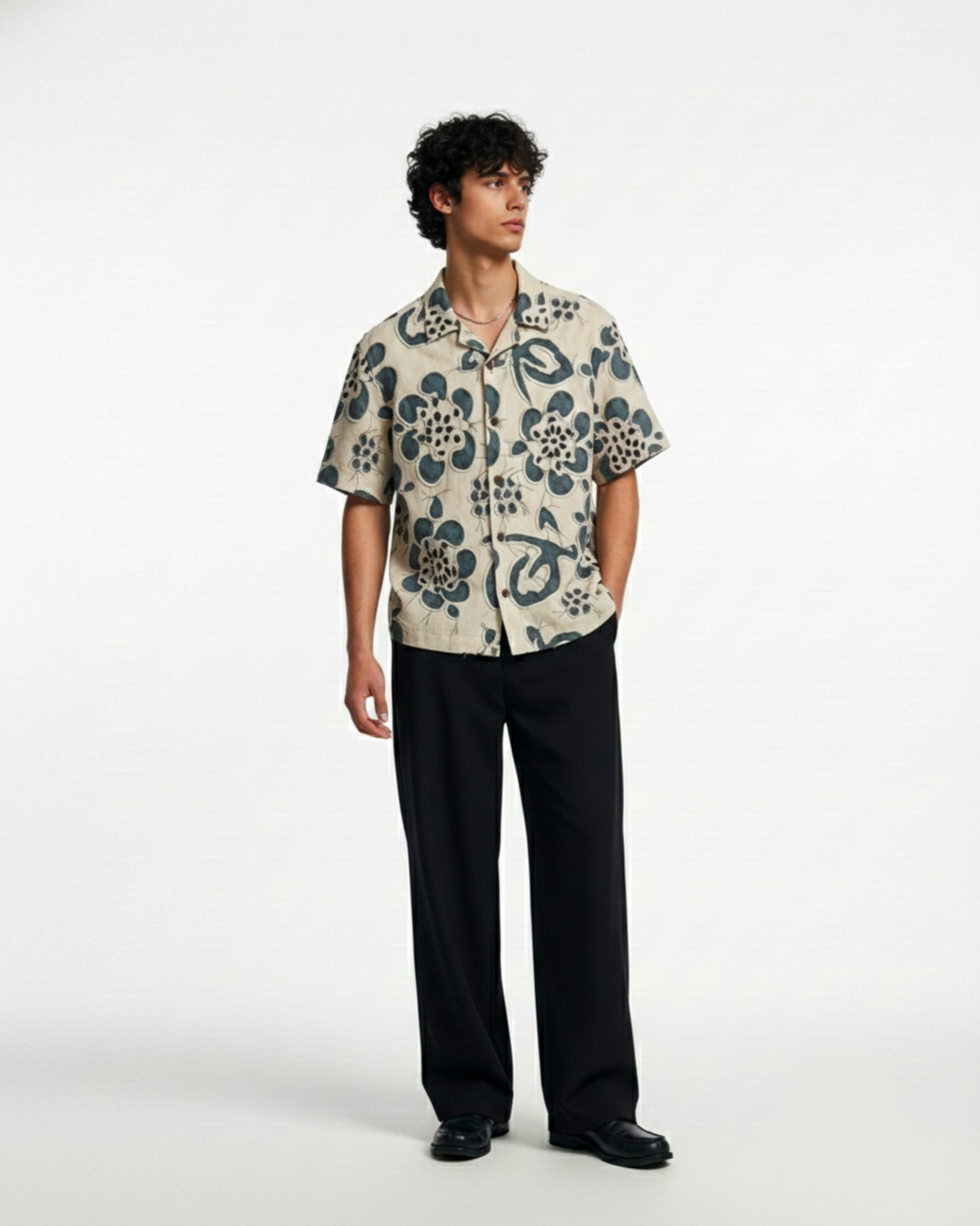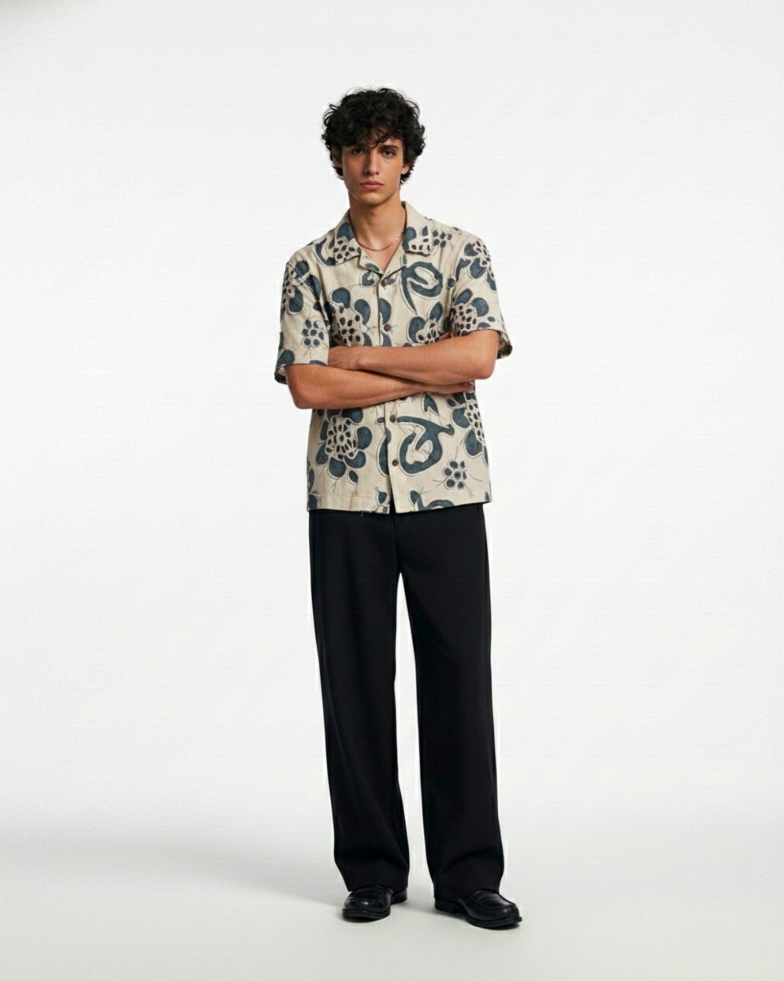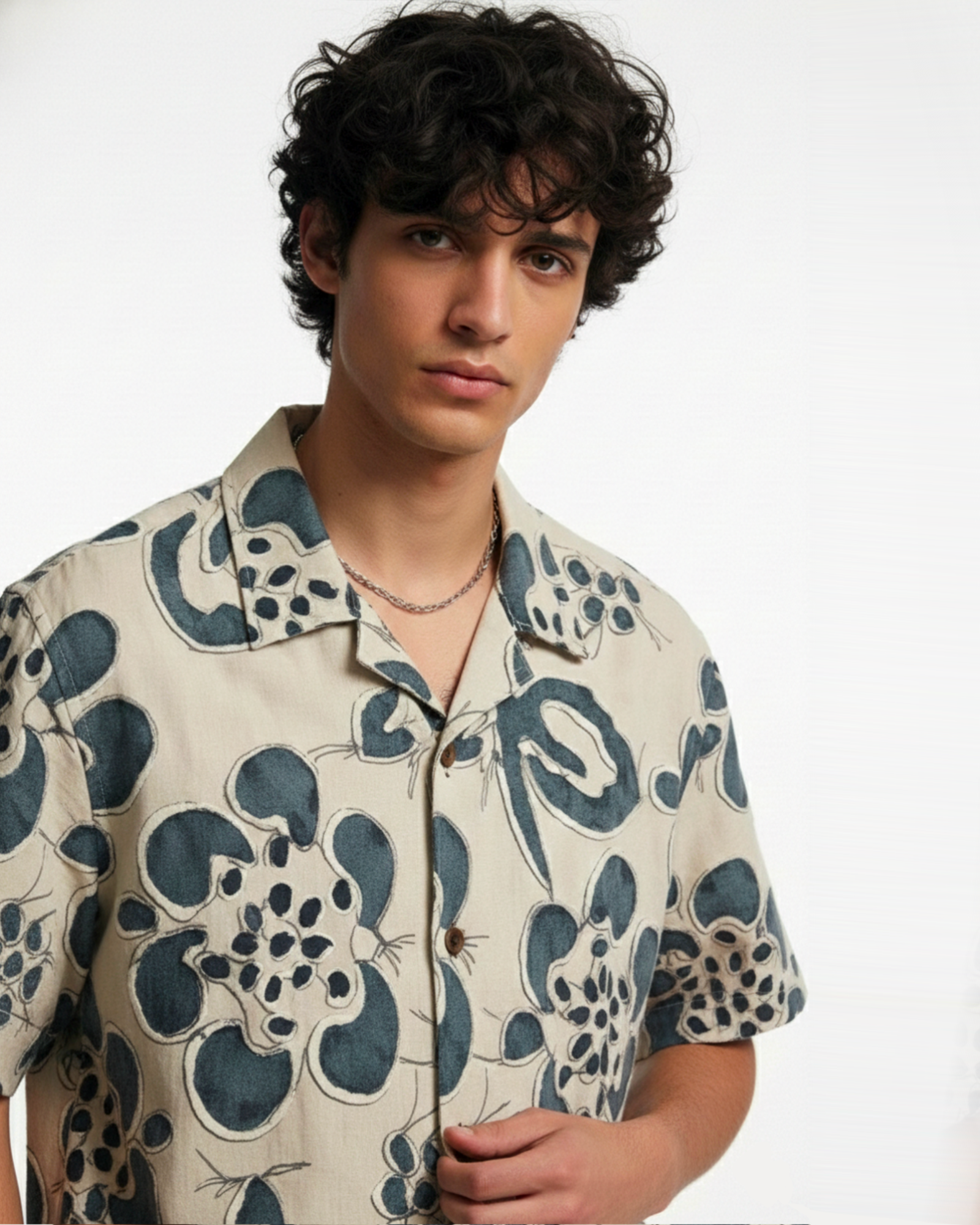 The Artisan Bloom Shirt is inspired by hand-drawn florals and sun-washed courtyards — where craftsmanship speaks softly but leaves a lasting impression. The indigo botanical motif rests against a warm ivory base, creating depth through texture and subtle contrast.