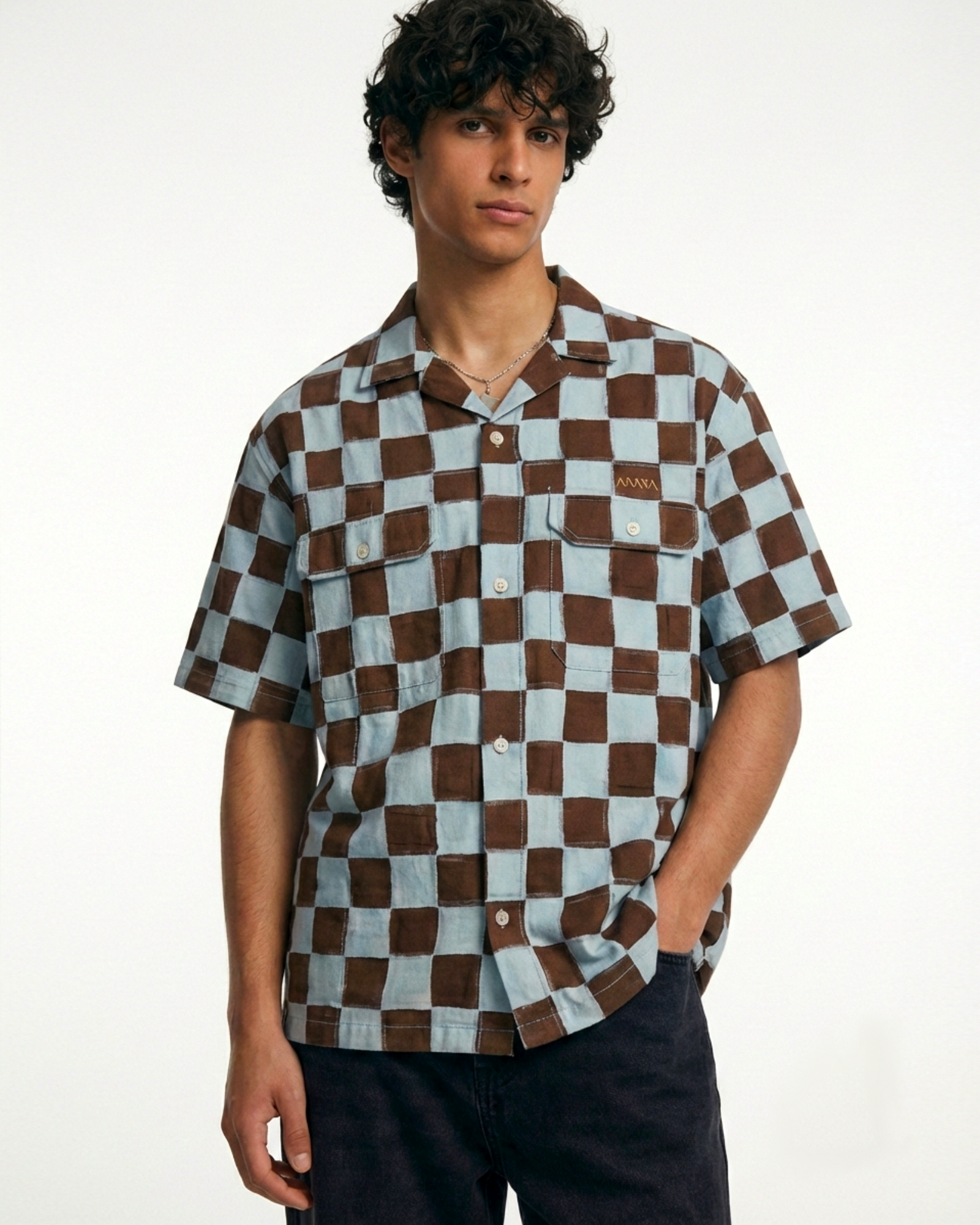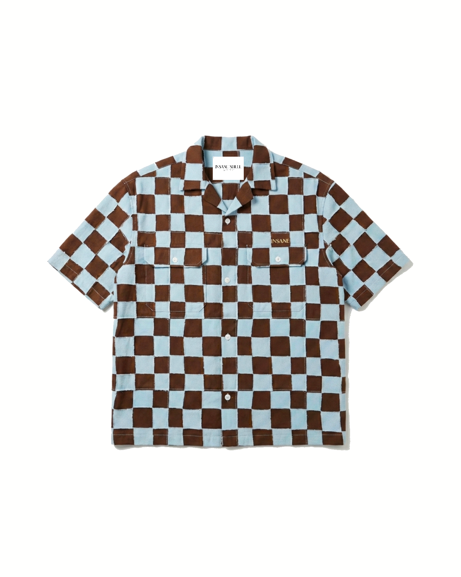 MAN HOURS : It takes minimum of 8 days to create shirt with a total of 2 artisans working on a single piece. It is completely hand made by patchworking and stiching all the pieces together in a checkerboard pattern, Insane Shell branding in detailed embroidery on the left chest.