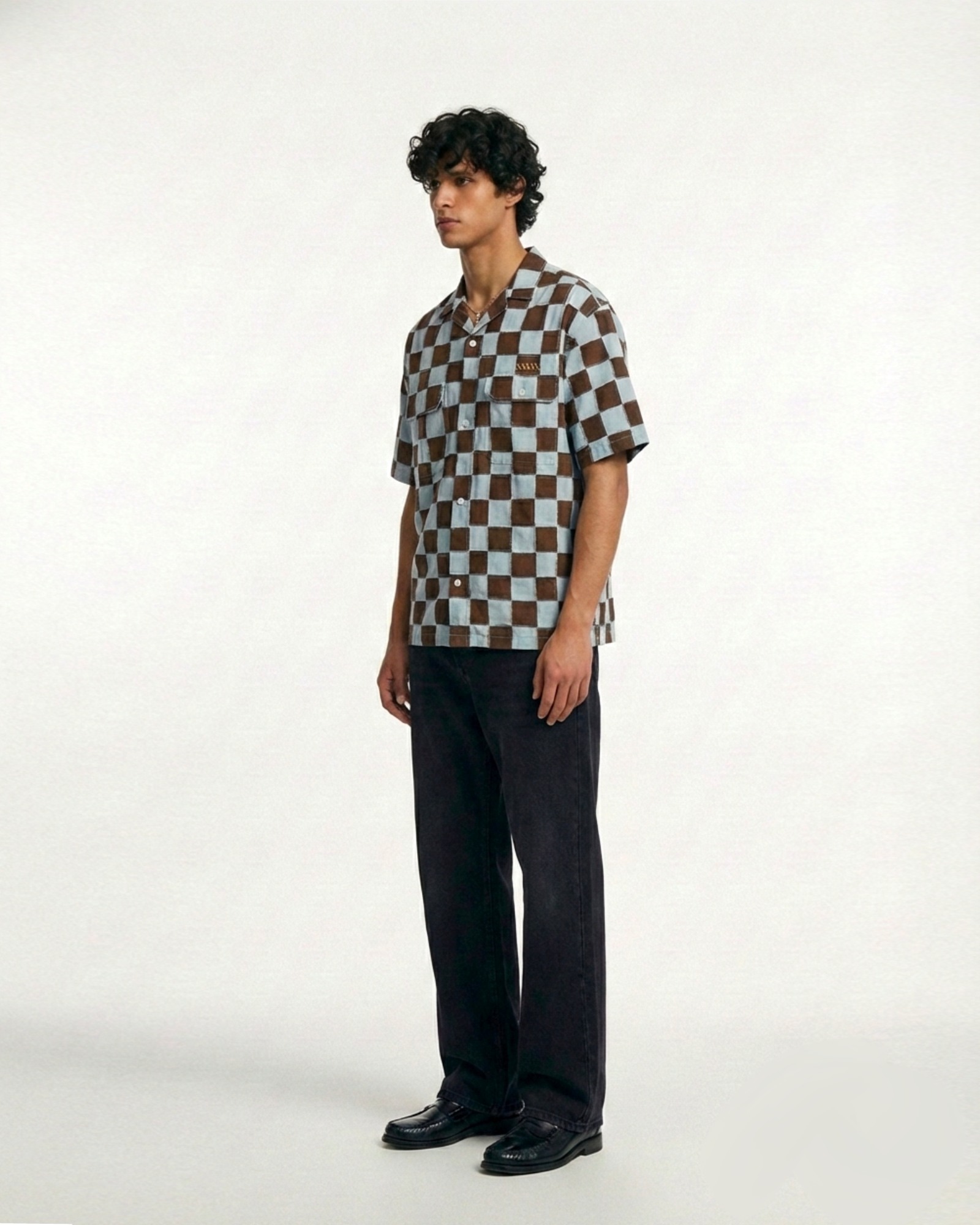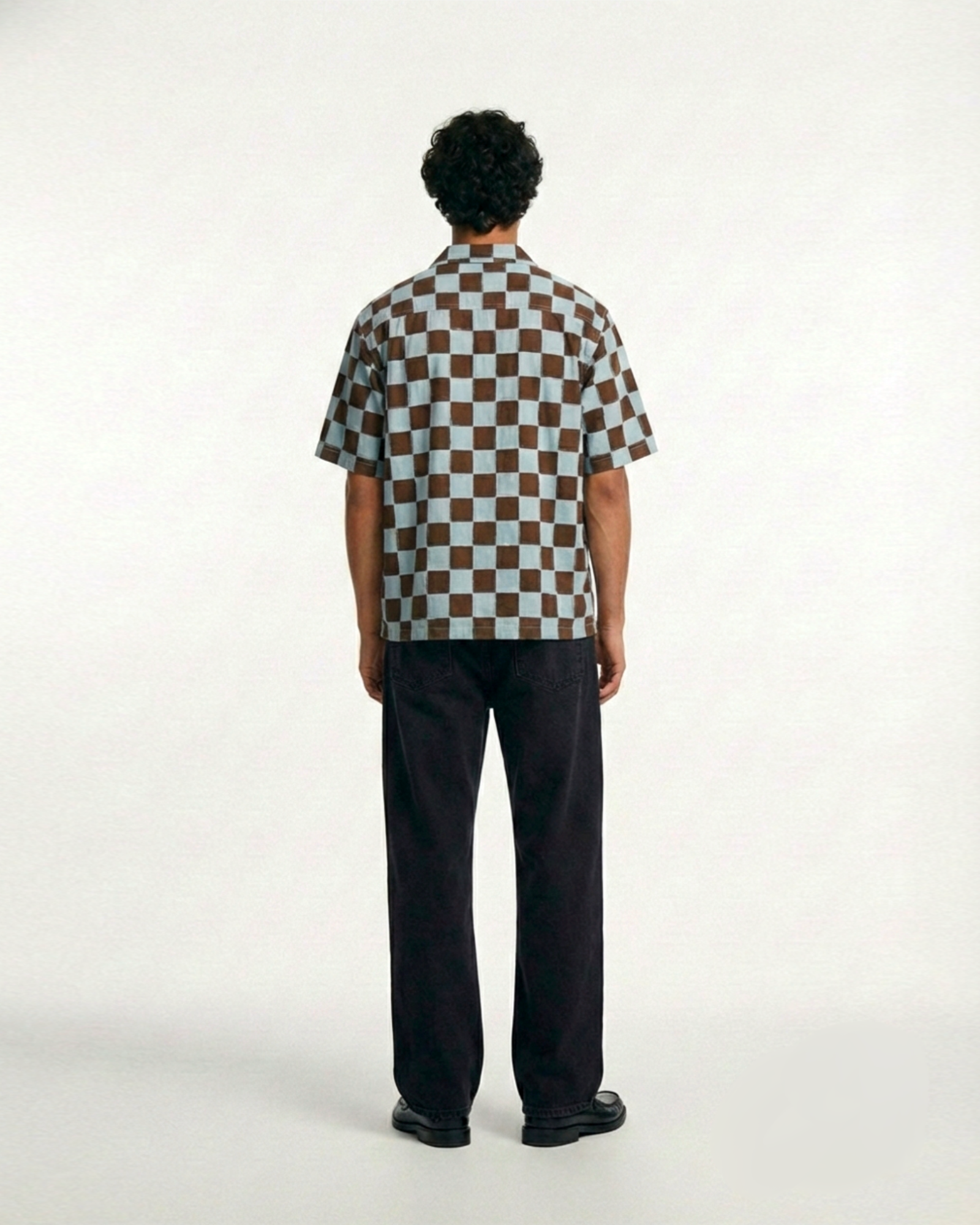 The Café Azure Shirt captures the ease of coastal mornings — tiled terraces washed in soft blue, espresso steam rising into open sky. The powder blue and espresso check feels architectural yet effortless, composed without rigidity.