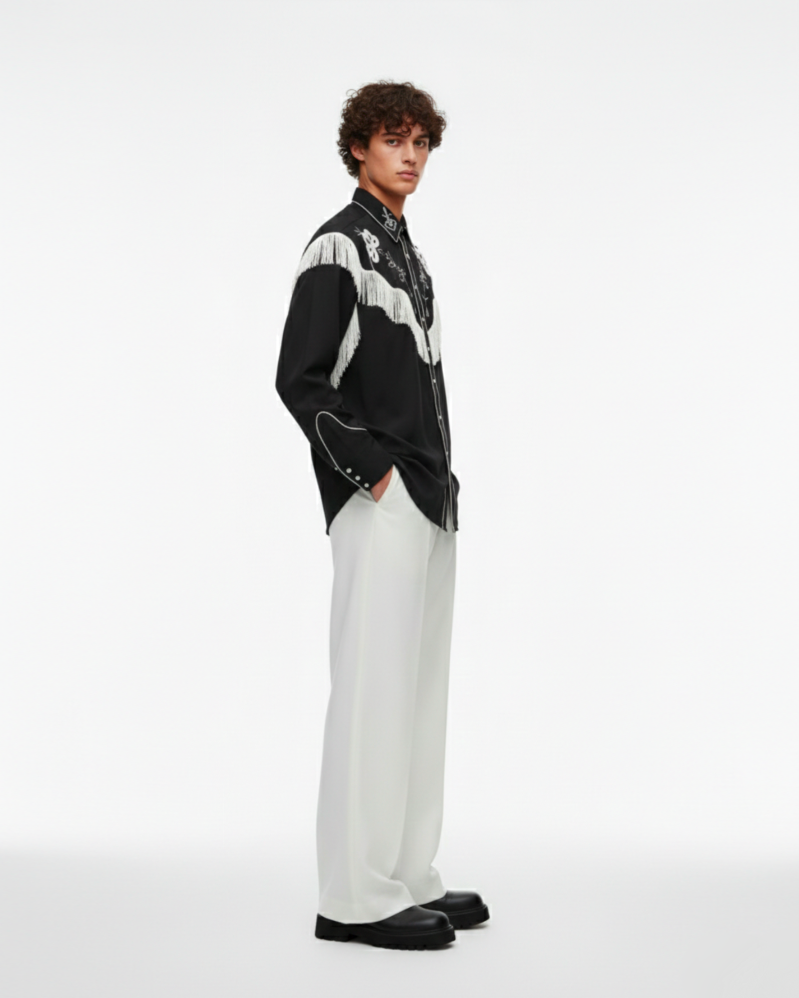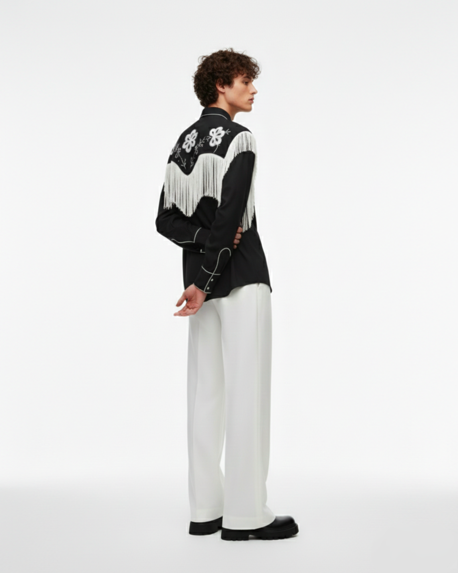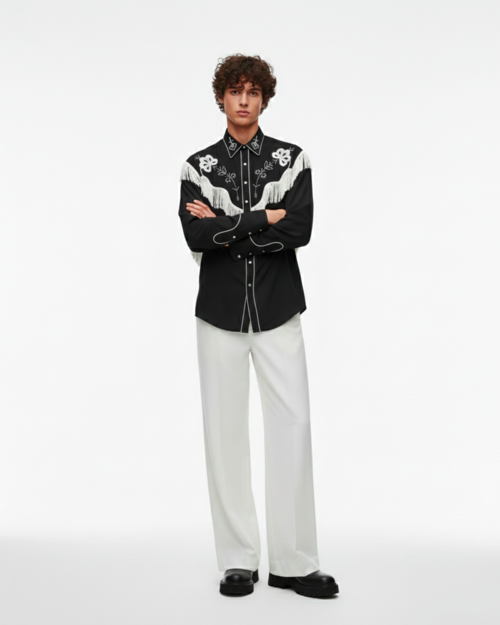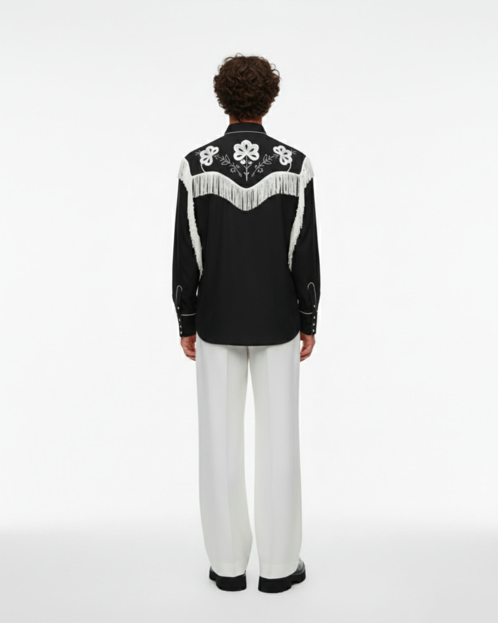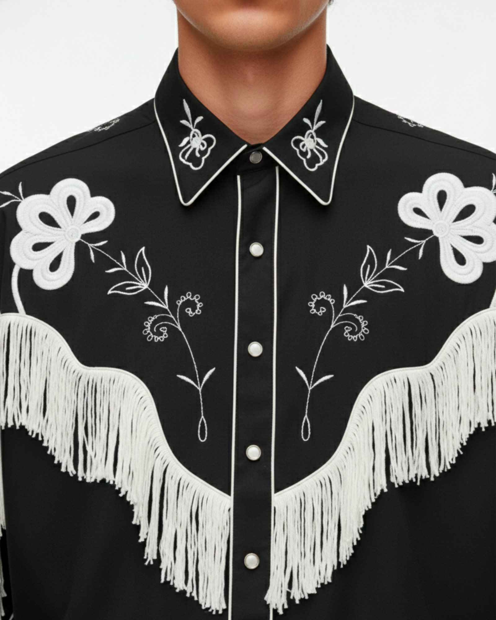 The Noir Frontier Shirt reimagines western heritage through a refined, modern lens. Set against a deep black canvas, intricate ivory embroidery traces the yoke and collar, while cascading fringe adds movement and drama with every step.