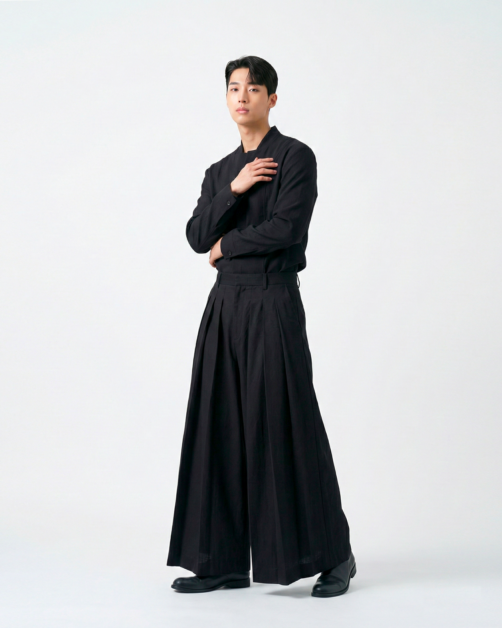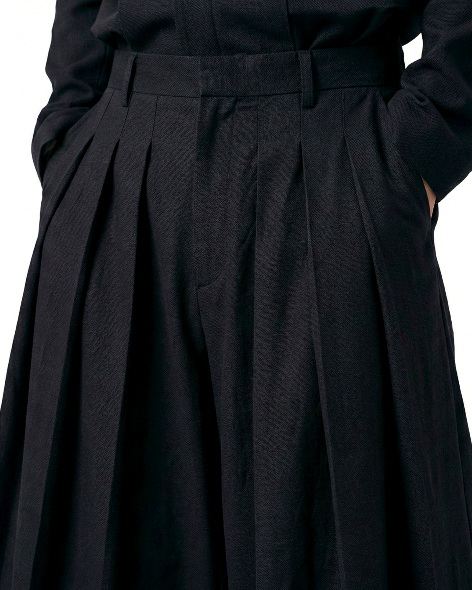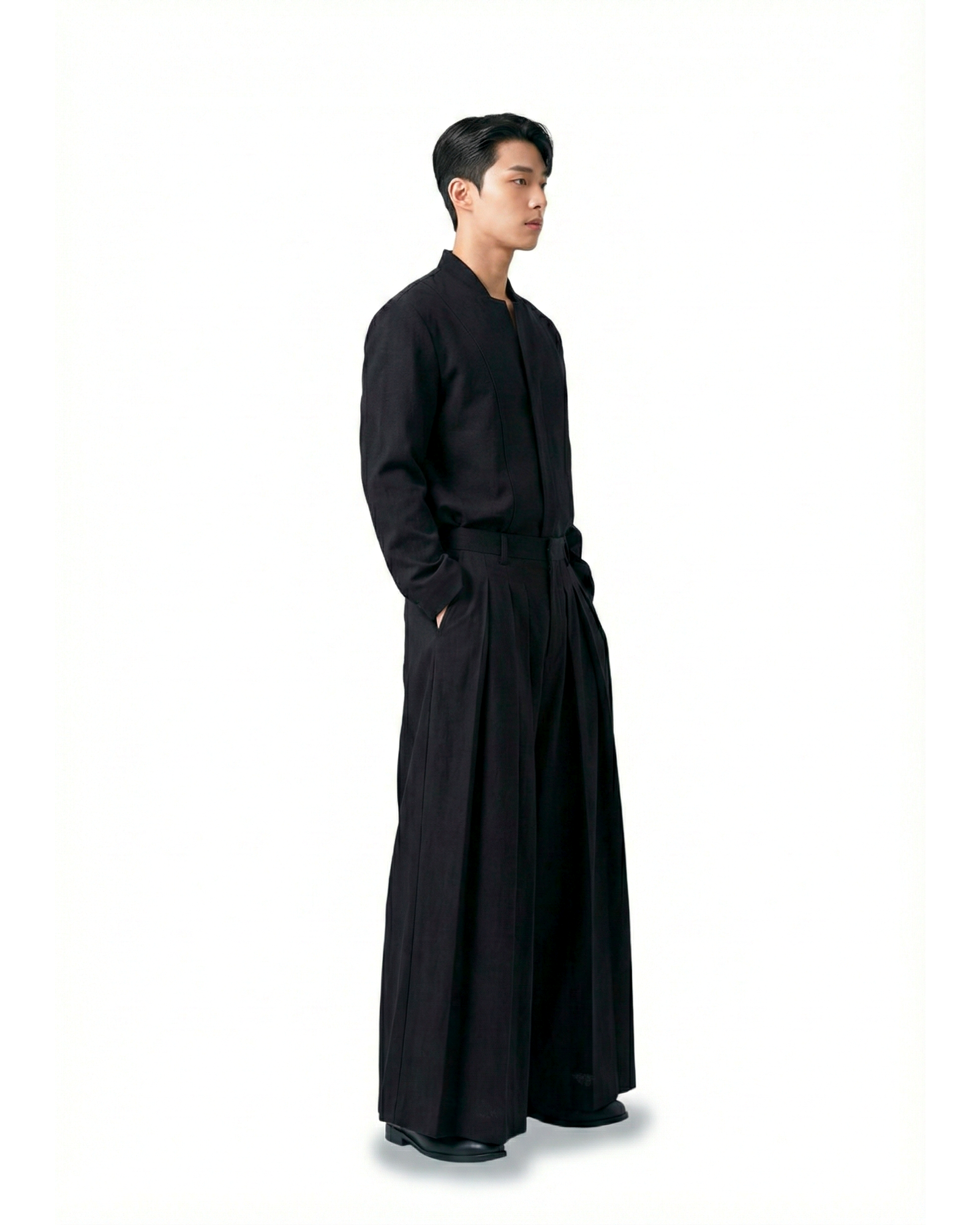 A relaxed yet structured pant, blending traditional haori styling with modern proportions.