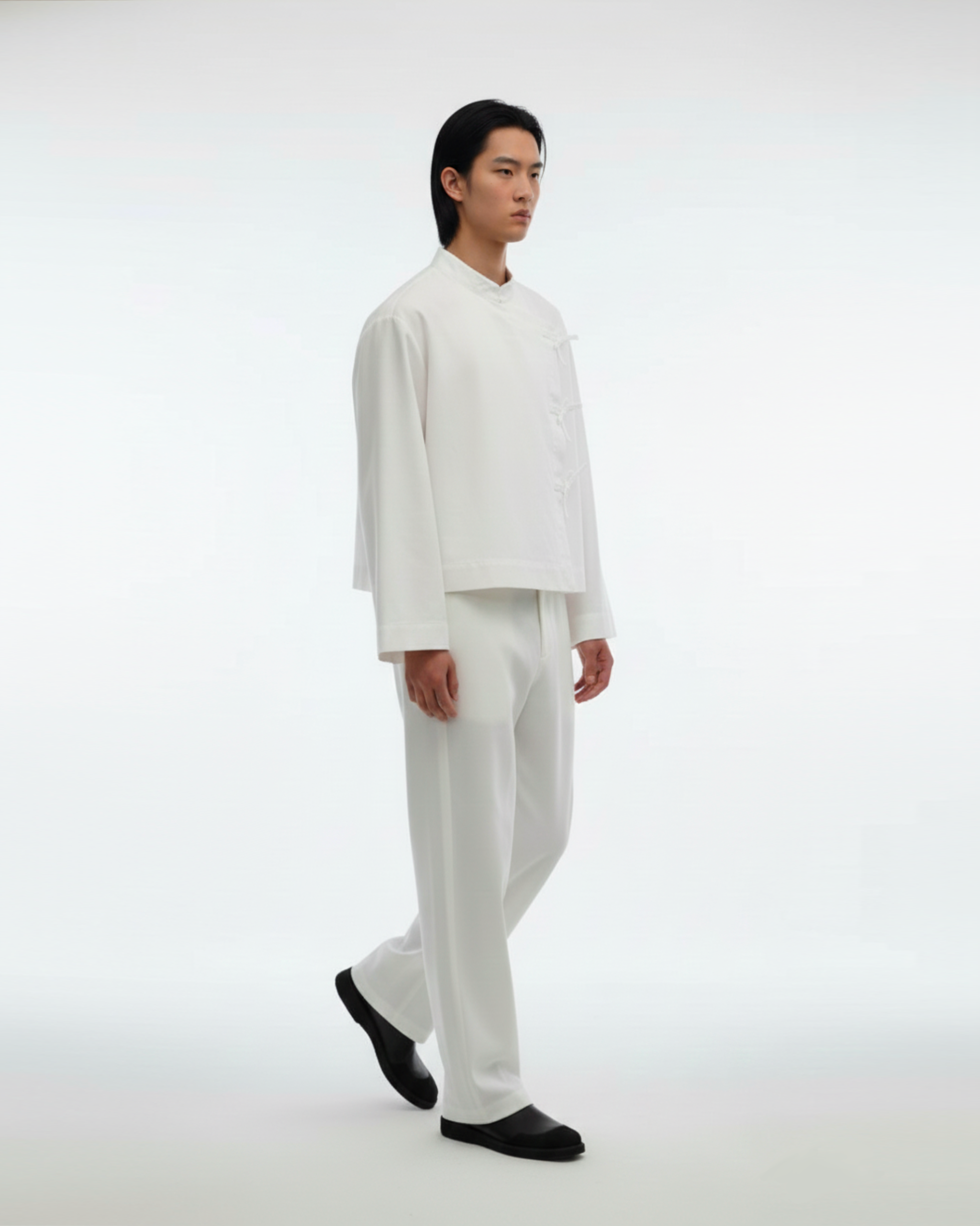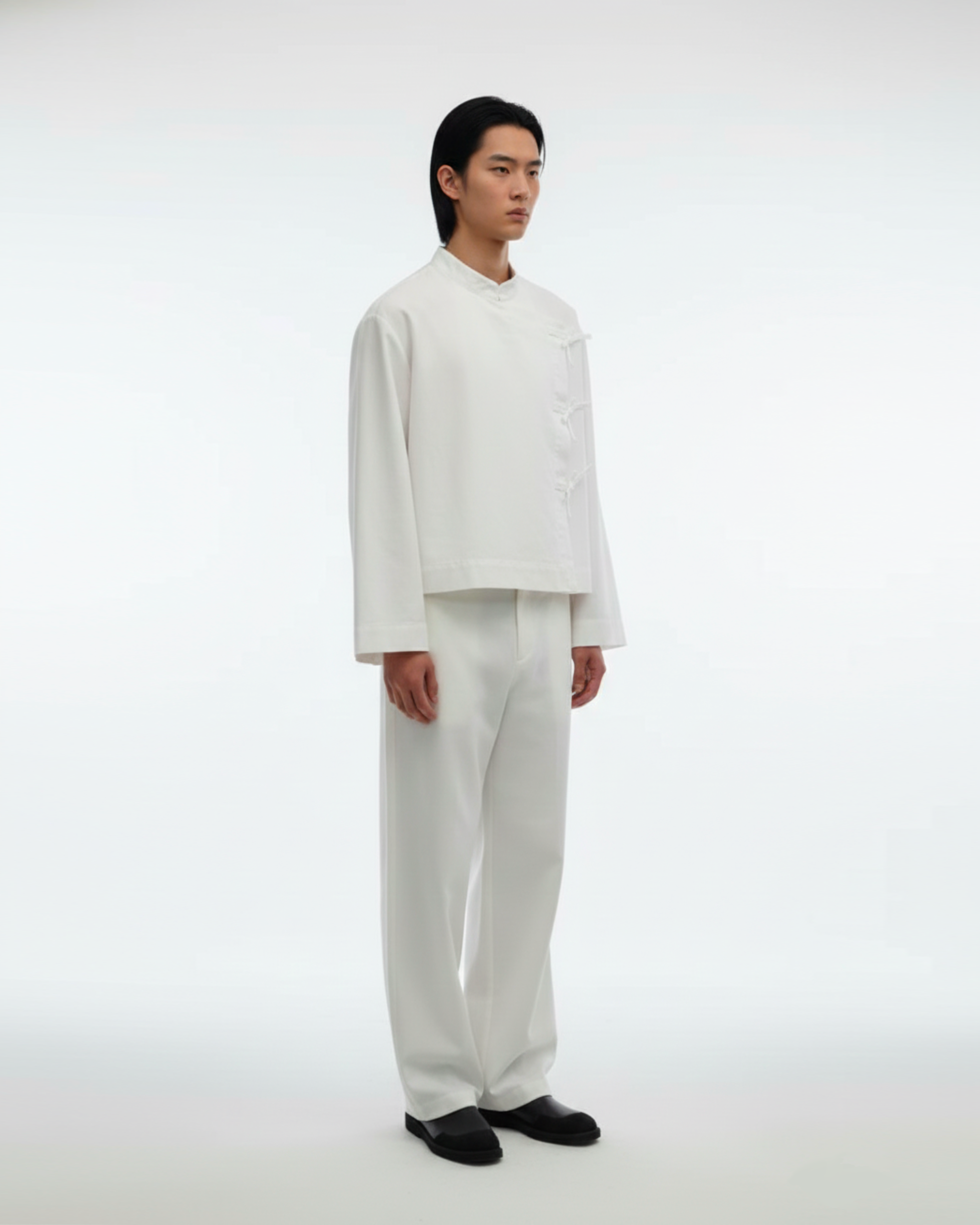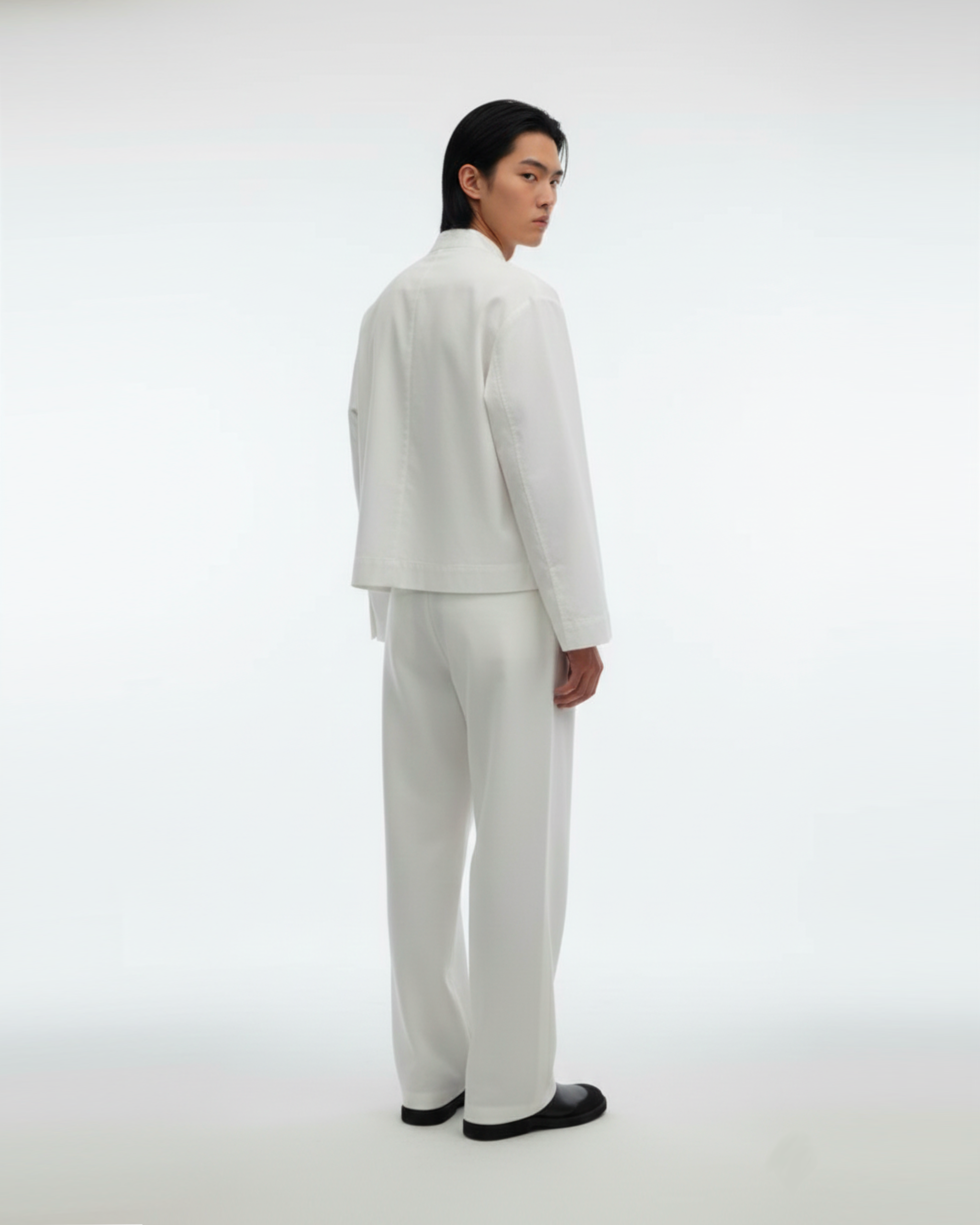 The wide-leg silhouette is disciplined by expert tailoring, ensuring that the fabric falls in an unbroken line from hip to hem. There is no unnecessary hardware, no distraction—only the pure, clean drape of high-quality cloth. Designed to anchor the Zen Shirt or stand alone as a foundation for a relaxed, elevated wardrobe.